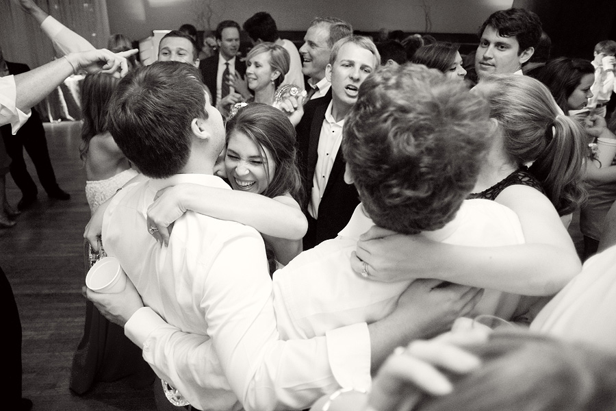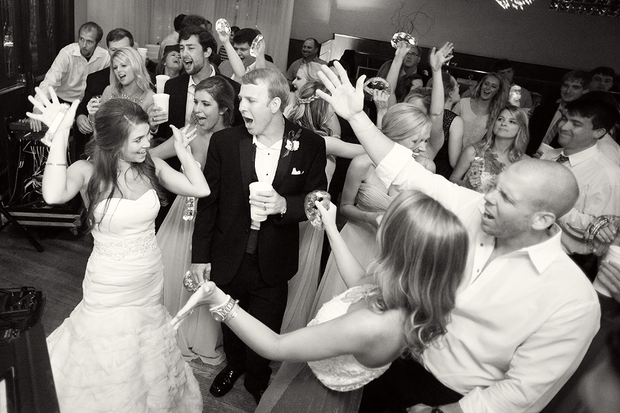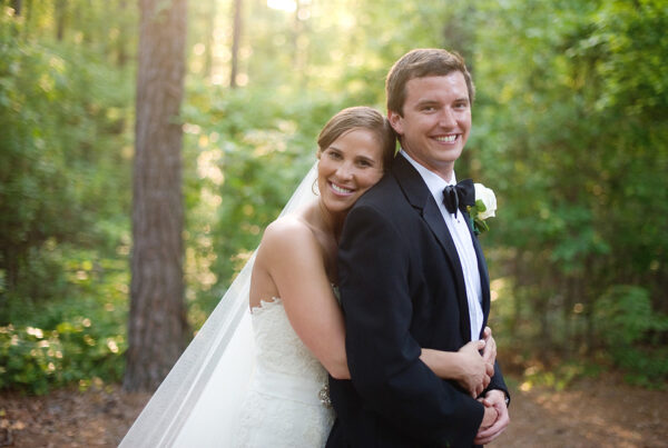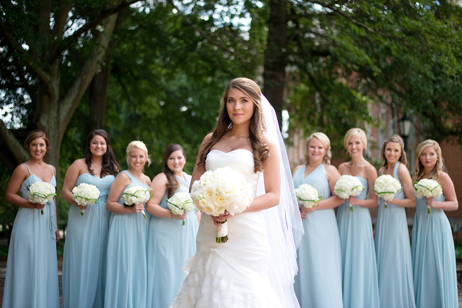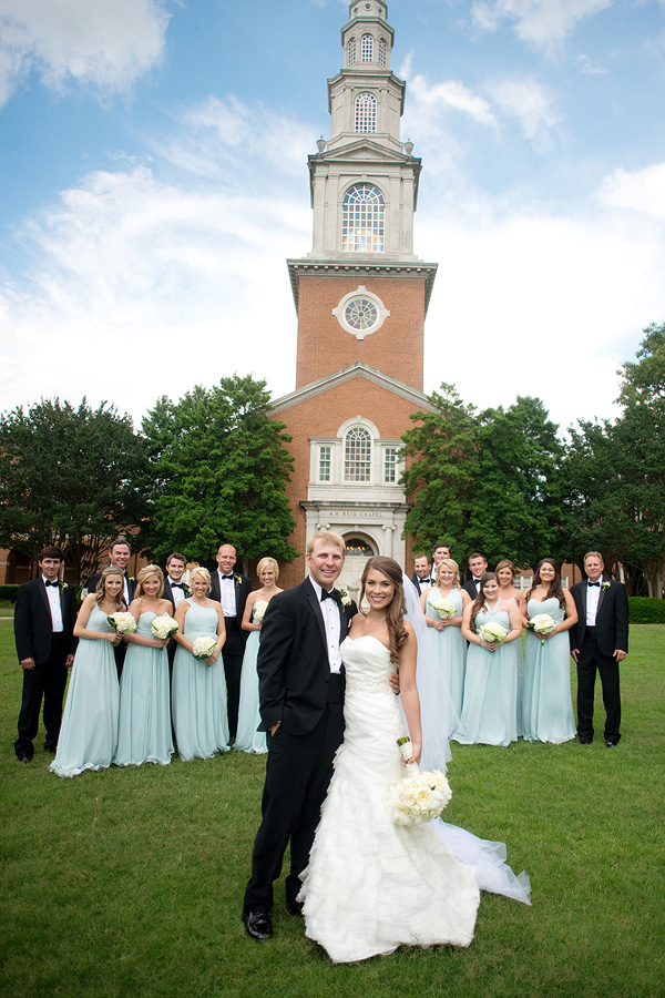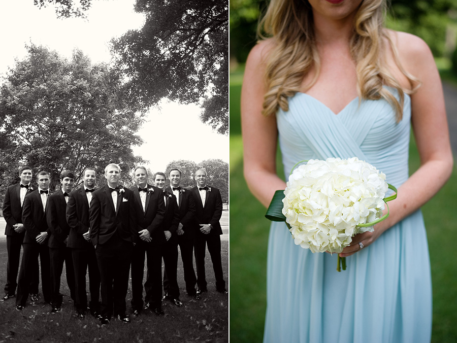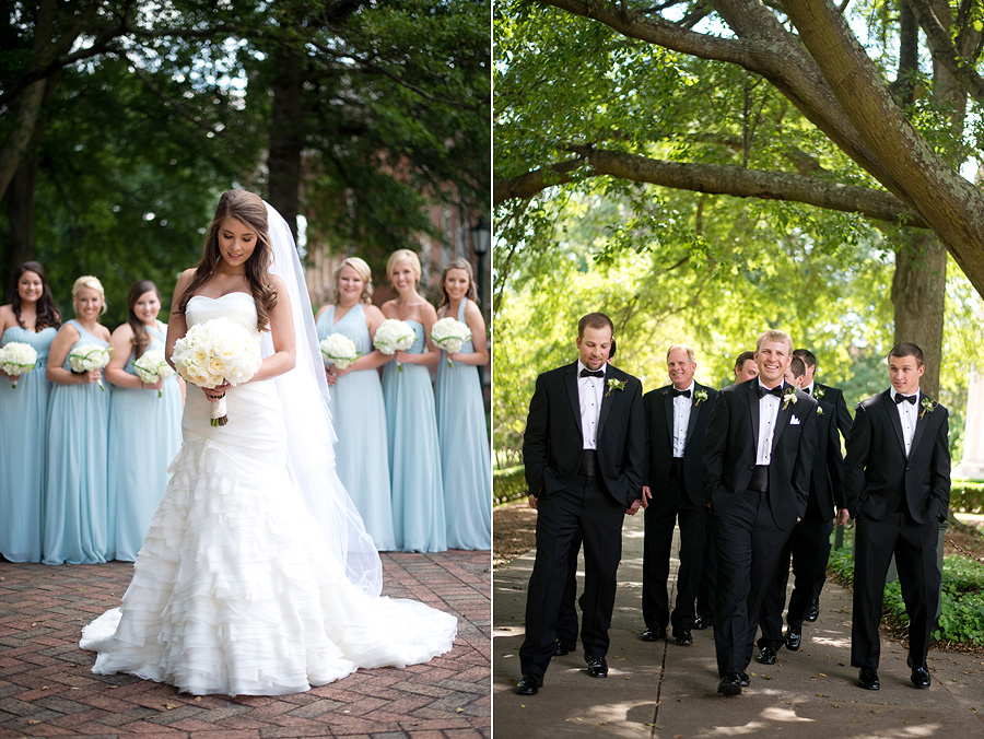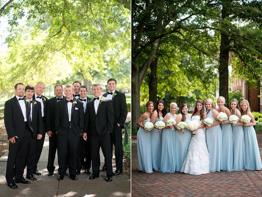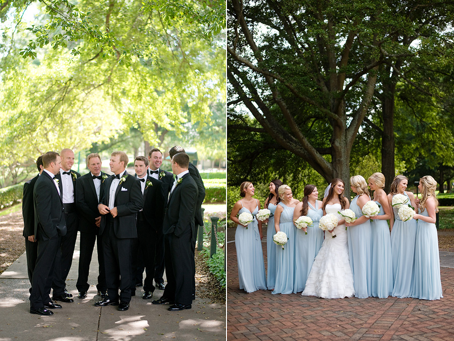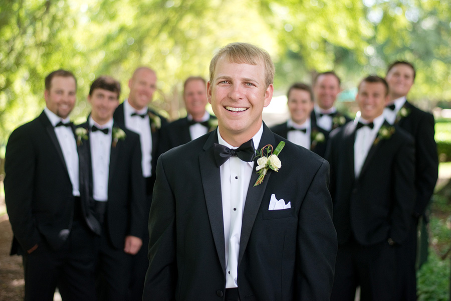 The color palette centered on ivory, black, and soft neutral tones, allowing texture and light to do the visual work. Spenser wore a strapless gown with a structured bodice and layered skirt, offering a silhouette that felt both traditional and graceful in movement. Nate and his groomsmen wore black tuxedos with bow ties, establishing a black-tie level of formality and a cohesive, tailored presence throughout the day. The wedding party was substantial in size, unified by clean lines and classic styling.