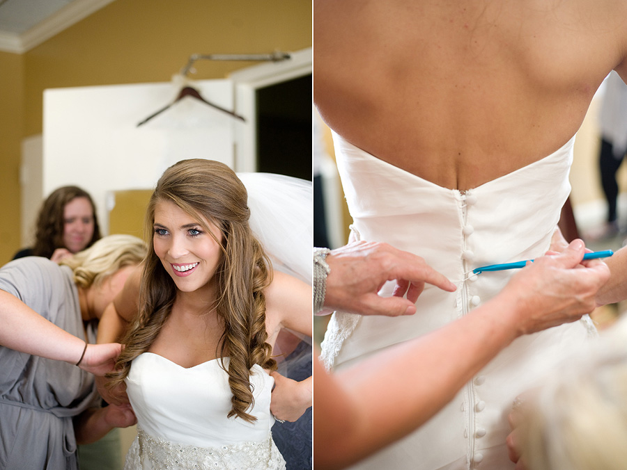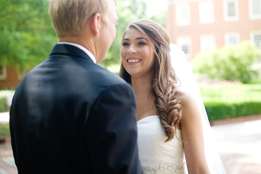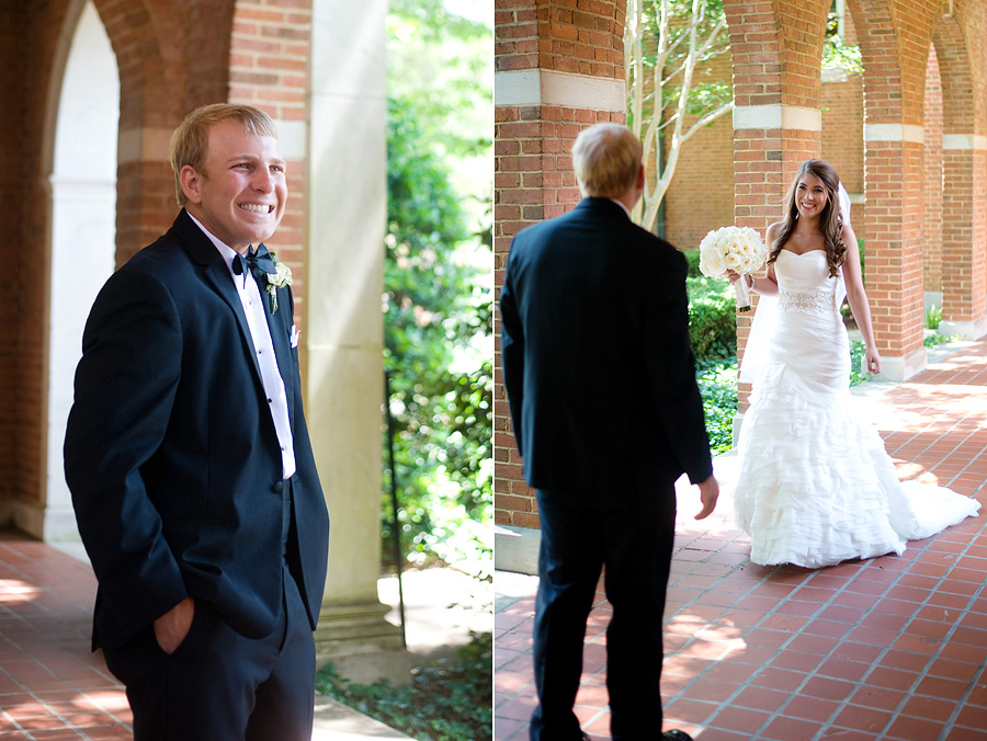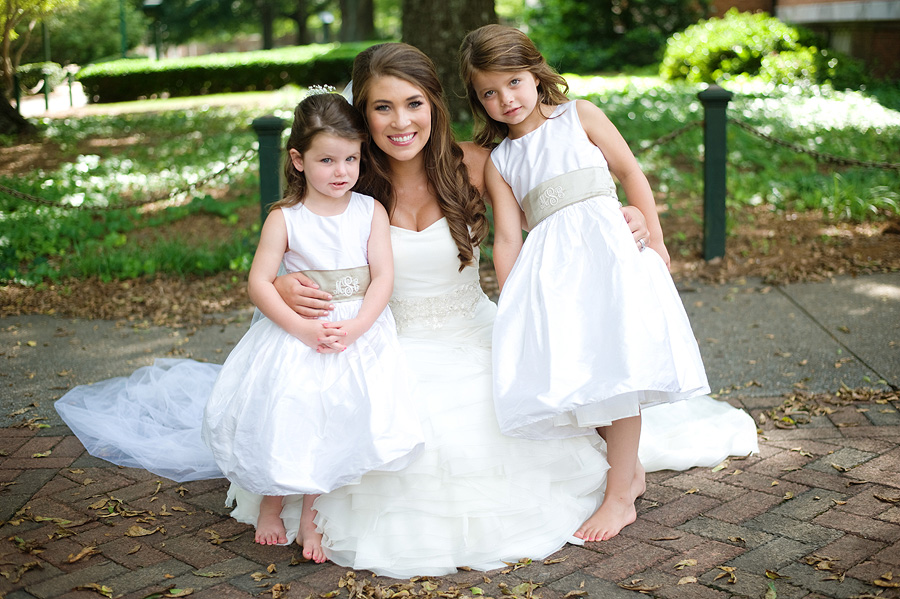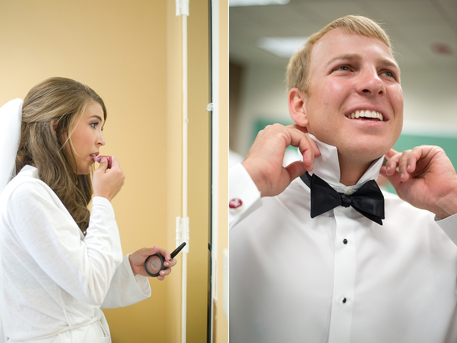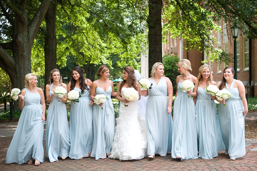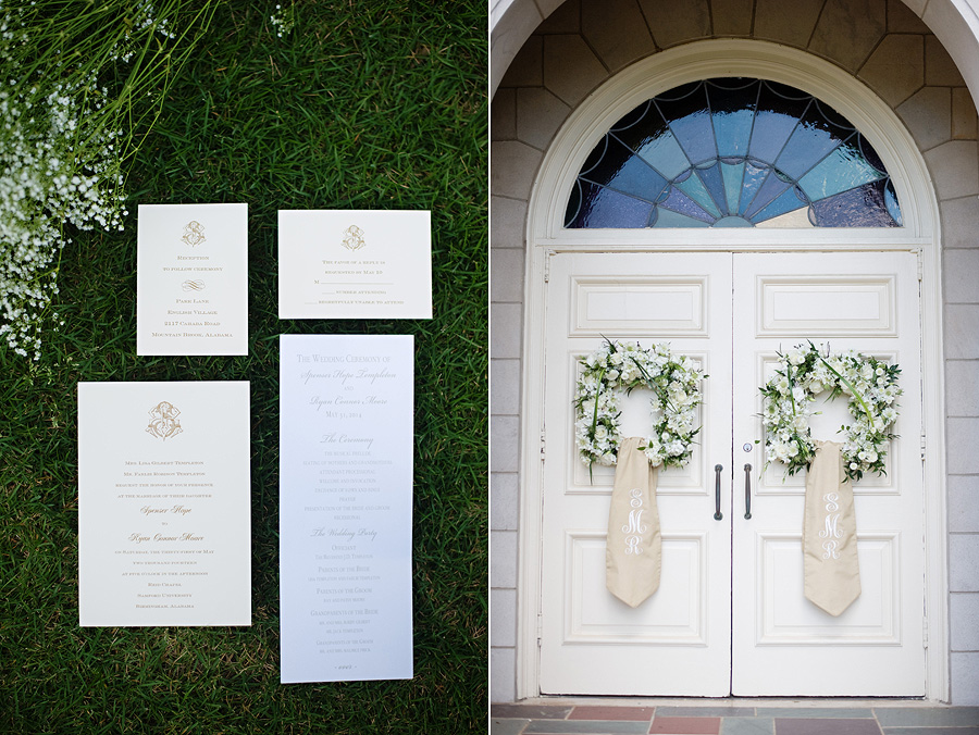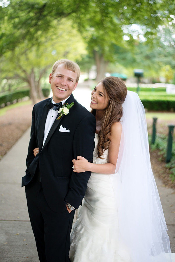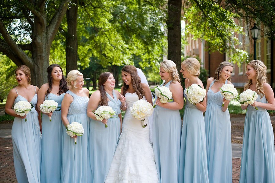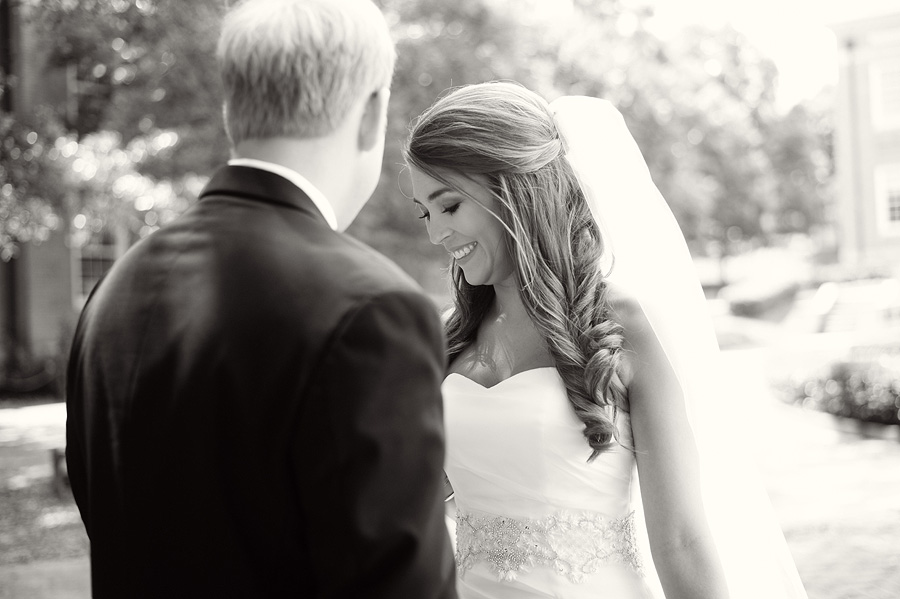 The color palette centered on ivory, black, and soft neutral tones, allowing texture and light to do the visual work. Spenser wore a strapless gown with a structured bodice and layered skirt, offering a silhouette that felt both traditional and graceful in movement. Nate and his groomsmen wore black tuxedos with bow ties, establishing a black-tie level of formality and a cohesive, tailored presence throughout the day. The wedding party was substantial in size, unified by clean lines and classic styling.
